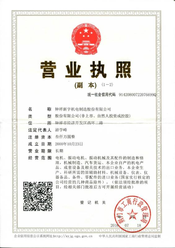 鐘祥新宇機電制造股份有限公司前身是鐘祥電機廠,創(chuàng)建于1968年,于2014年9月24日由“鐘祥新宇機電制造有限公司”變更名為“鐘祥新宇機電制造股份有限公司”。主要生產(chǎn)各類振動電機、振動機械、輸送機械。是中國電器工業(yè)協(xié)會中小型電機分會理事單位、中國重型機械工業(yè)協(xié)會洗選設(shè)備專業(yè)委員會理事單位,是中國具備真實生產(chǎn)實力的振動電機生產(chǎn)廠家。 ■ 企業(yè)產(chǎn)品 振動電機:VA、VB系列振動電機、VBH系列頻繁起動振動電機、VBL立式振動電機、VBB系列隔爆振動電機、VLB系列戶外隔爆振動電機、VBCB側(cè)板式振動電機、VLBL鋁殼長桿振動電機。 振動機械:側(cè)板式激振器、直線振動篩、圓振篩、振動給料機、振動料斗、振動輸送機、振動放礦機、帶式輸送機。 ■ 企業(yè)優(yōu)勢 科研開發(fā)力量雄厚,公司技術(shù)中心認定為“湖北省企業(yè)技術(shù)中心”,現(xiàn)有教授級高級工程師2人,享受國家政府津貼專家2人,是國家部頒(行業(yè))標準《振動源三相異步振動電機技術(shù)條件》的主要制訂單位。企業(yè)內(nèi)部局域網(wǎng)、公司網(wǎng)站、CAD設(shè)計系統(tǒng)、互聯(lián)網(wǎng)已構(gòu)筑起企業(yè)計算機信息管理系統(tǒng);企業(yè)質(zhì)量管理體系獲得ISO9001:2000質(zhì)量管理體系認證證書;產(chǎn)品獲CQC認證和CCC認證;享有“外貿(mào)進出口自營權(quán)”。是國內(nèi)很早生產(chǎn)振動電機的廠家之一,生產(chǎn)的“宇興”牌振動電機是國內(nèi)振動電機行業(yè)和廣大客戶公認的品牌產(chǎn)品。 ■ 企業(yè)榮譽 “湖北省著名企業(yè)”、“高新技術(shù)企業(yè)認定證書”、“實用新型專利證書”、“湖北名牌產(chǎn)品證書”、“湖北省企業(yè)技術(shù)中心”、“國家重點新產(chǎn)品證書”、“優(yōu)秀民營科技企業(yè)”、“國家重點新產(chǎn)品證書”。